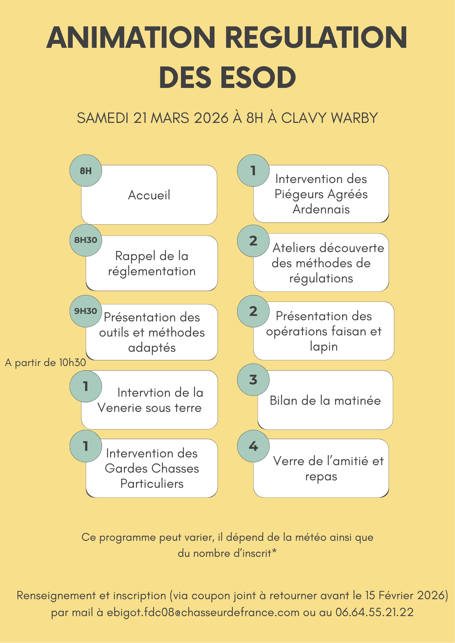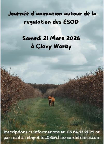 Je vous informe que la Fédération Départementale des Chasseurs des Ardennes en collaboration avec le GIC des Crêtes Pré-ardennaises et la participation des associations des piégeurs agréés, des gardes particuliers et des Veneurs sous terre organise une journée d’animation autour de la régulation des ESOD.